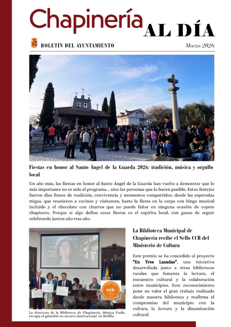Cada mes encontrarás en sus páginas las noticias más relevantes, actividades culturales y deportivas, avisos de interés, iniciativas locales y todo aquello que forma parte de la vida diaria de Chapinería. Nuestro objetivo es acercarte la actualidad de forma clara, cercana y útil para que no te pierdas nada.